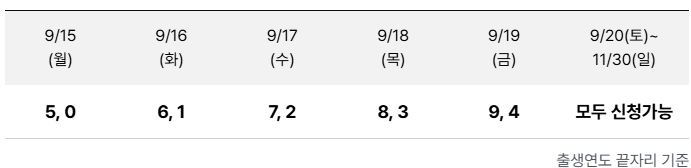 상생페이백은 원활한 신청을 위해 신청 첫 주간 5부제를 시행하여 출생연도 끝자기 기준 요일제를 운영합니다. 9월 20일 토요일 부터는 제한없이 자유롭게 신청이 가능합니다.