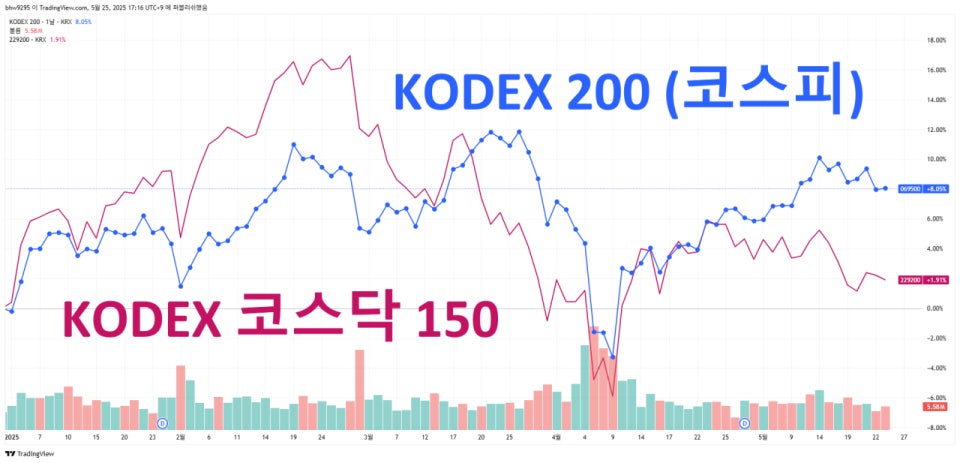 📌 코스피(파란선)와 코스닥(붉은선)의 비교 차트 – 코스닥은 소형주 ·기술주 중심으로 변독 폭이 더 큽니다.